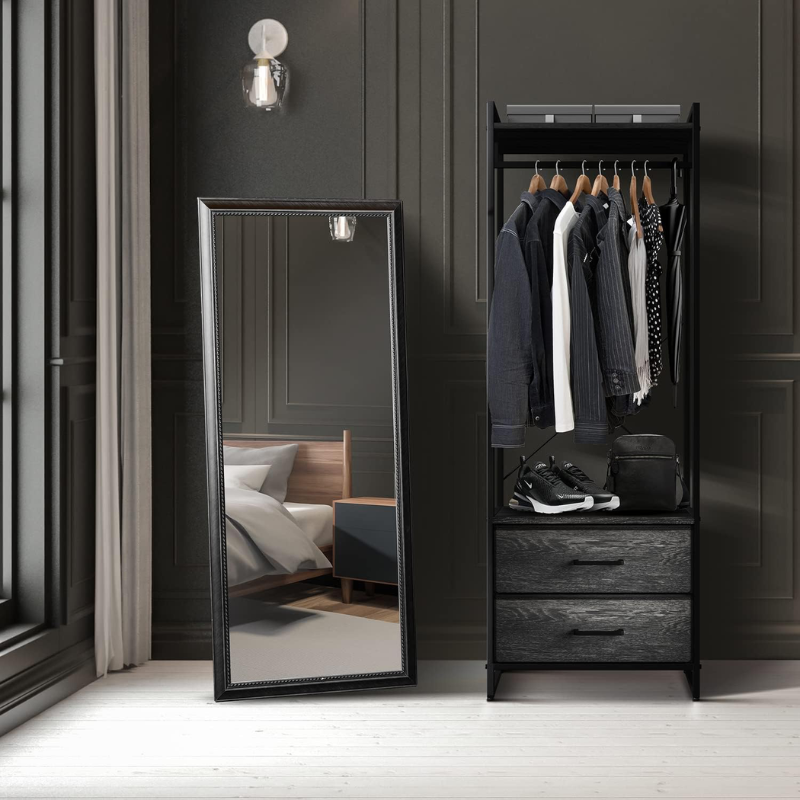 Clothing Rack Dresser — Display your closet essentials on the Sorbus Clothing Rack including shirts, dresses, pants, jackets, and more — Store smaller items in the two dresser drawers down below such as socks, underwear, & pajamas — Utilize the top shelf to store hats, purses, & boxes