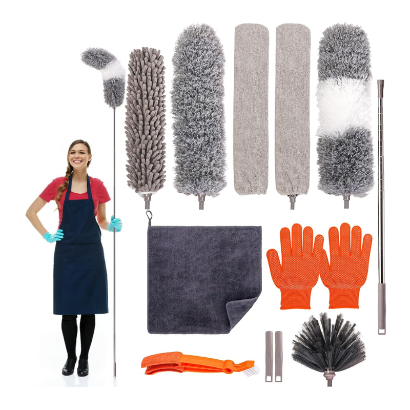 Value Package: Include 12 pack dusting tools, 1 stainless steel Telescopic pole, 2 hangable handle short pole, 2 bendable microfiber duster head, 1 bendable chenille duster head, 1 crevice Brush, 1 replacement crevice brush cloth, 1 cobweb duster head, 1 blinds duster, 1 microfiber cleaning cloth, A pair of gloves.