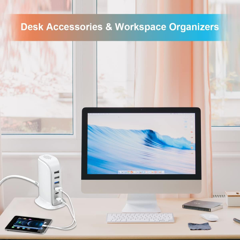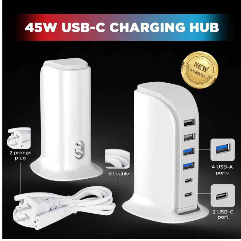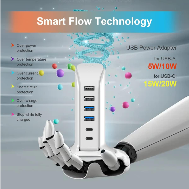 Charger block total 8A, USB adapter compatible 5W/10W/15W/20W, kawaii desk accessories for Iphone/Samsung. Charging station 6 ports with 5 ft power cord; Compact, Lightweight, Space saving, Portable, Versatile, USB charging hub for 6 devices simultaneously. Charging tower with 4 usb-a and 2 usb-c ports, glossy shell&small footprint; travel accessories for men, women, teens. Built-in smart IC against overload, overvoltage, over-temperature, over-charge and short circuits. Integrated charging accessories for Smart Phone, Tablet, Headphone, Kindle, Oculus, Gaming Controller and more.