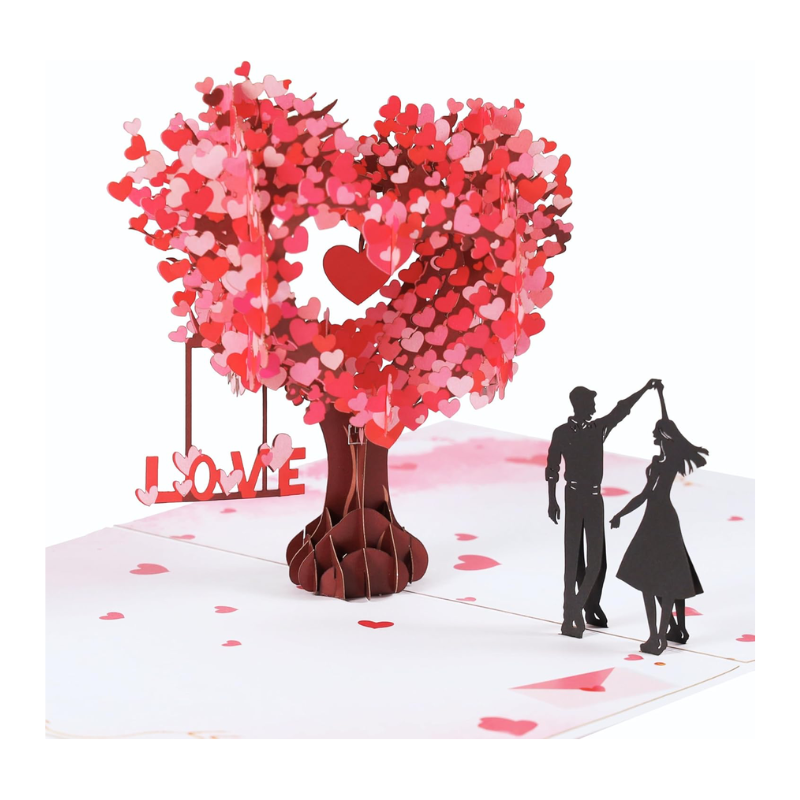 When the popup card is opened, it pops into a beautiful 3D design of a tree with leaves shaped like charming hearts and a happy couple dancing. It’s a love-filled scene, making it the ideal gift for a Wedding Anniversary.