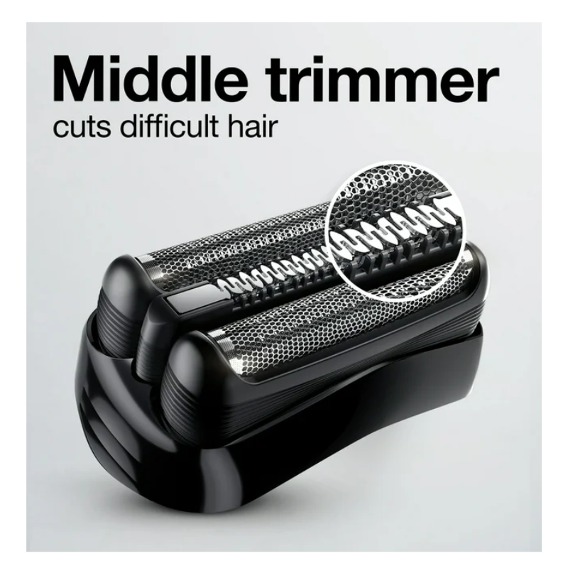 Tough on beards and smooth on the skin, Braun Series 3 Electric Shavers for men provide a comfortable and efficient shaving experience. This face and beard shaver features three pressure-sensitive shaving elements (3-Flex head) that automatically retract to protect your skin and adapt perfectly to facial contours for a close and gentle shave. Braun’s patented Senso-Foil (twin foils) protects your skin from the ultra-sharp blades while working together with an integrated middle trimmer to effectively cut both long and short hairs. The full shaving power of the Series 3 is built in a super thin head, allowing you to easily reach difficult areas like under the nose. This wet and dry foil shaver is 100% waterproof and can be used with foam, gel or even under the shower. Plus, you can conveniently rinse the electric shaver under running water for easy cleaning.