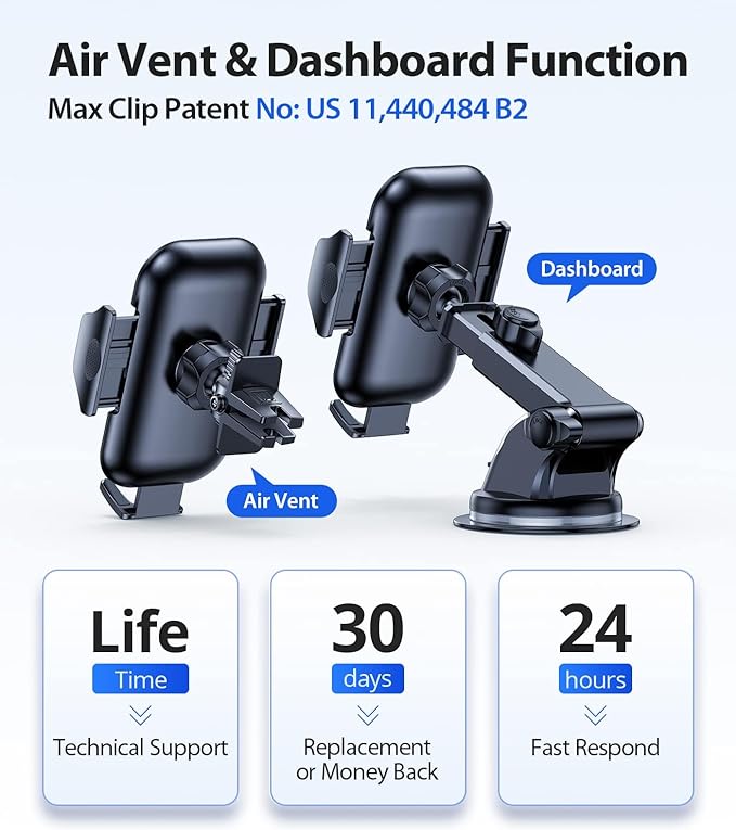 • [Stable and Safe Car Phone Mount] Upgraded super strong stickiness suction cup, and 2-step lock mechanism provide extremely strong suction power. It can stay securely in the car. The extra dashboard pad, provides smooth surface. So the iPhone car holder can stay more firmly and securely. The extremely flexible air vent clip fits most of cars; the silicone on the clip helps this vent phone holder grip tightly on the air vent and protects the blades from scratching.