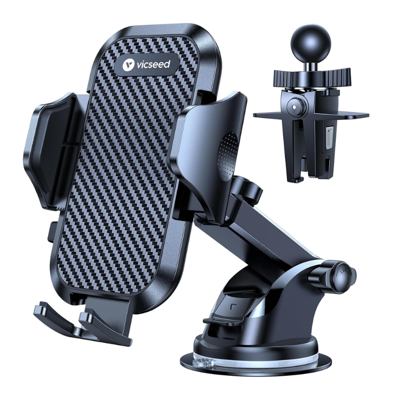 - This Vicseed phone mount for car is the most durable phone clamp. The high quality carbon fiber panel always keep itself in clean condition, and wash and work as new, new as Day 1. It won’t suck ash easily then get super dirty and ugly. It is made of temperature resistant Airplane PTFE, won’t deform or bubbling like other silicone phone clamps. You deserve to get this durable car phone mount.