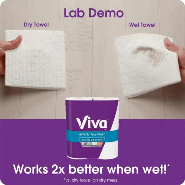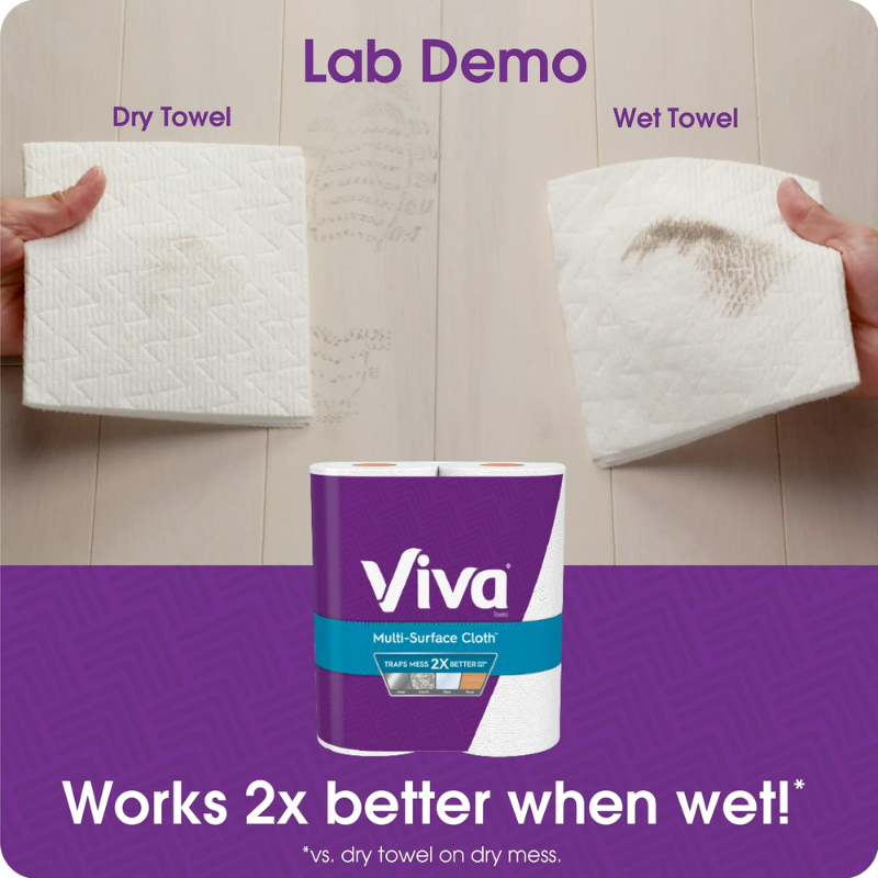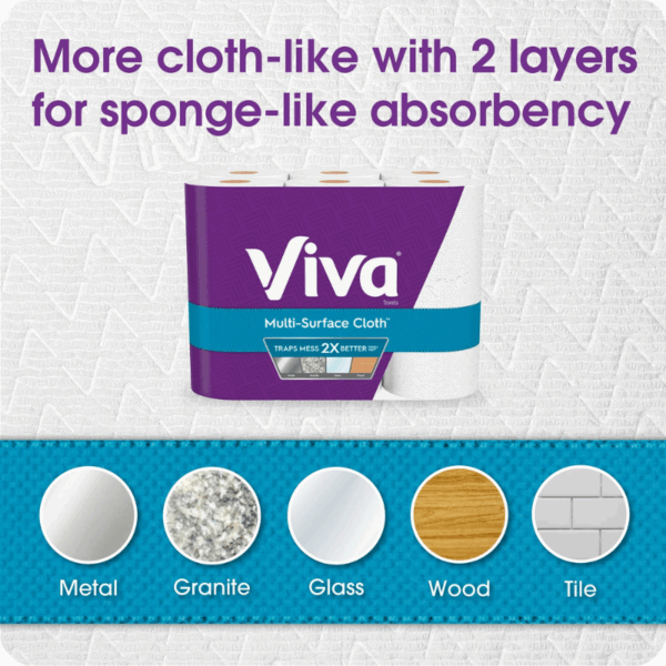 Viva Multi-Surface Cloth Paper Towels are designed with a unique texture to lift & trap mess on the kitchen countertop, bathroom surfaces and all the rooms in-between.