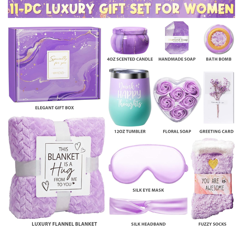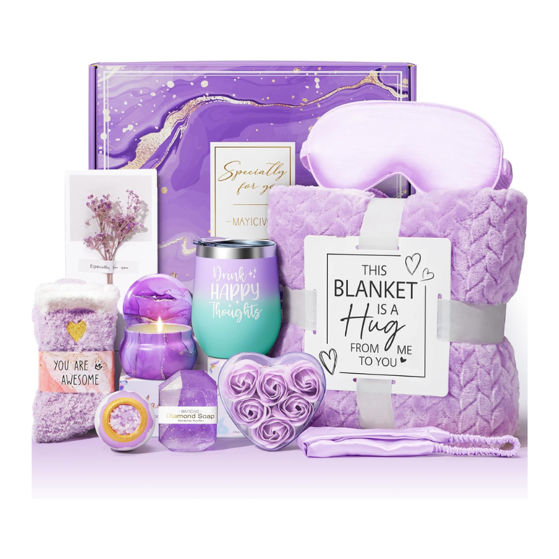 MAYICIVO Spa Gifts Box Purple Gifts for Women contains all carefully-designed thoughtful goodies, including luxury flannel blanket,12oz insulated tumbler, 4oz lavender scented candle, handmade soap, bath bomb, floral-scented soap, silk eye mask, silk headband, fuzzy socks, dried flower gift card and elegant gift box.