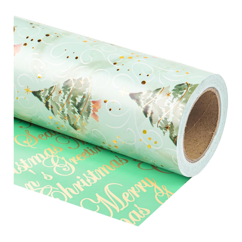 REVERSIBLE: Christmas tree printed on one side, “Meery Christmas”, “Season’s Greeting” lettering printed on the reverse. Two different designs make unique and varied gift presentations easy.